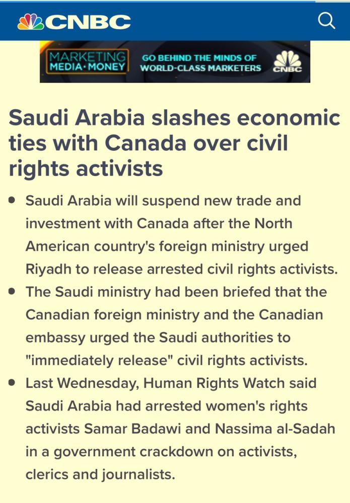 وأشارت سي إن بي سي الأمريكية إلى أن السعودية قطعت العلاقات الاقتصادية مع كندا نتيجة مطالبتها بإطلاق نشطاء فورا وهو ما دعا الرياض إلى تعليق التجارة والاستثمار مع كندا.