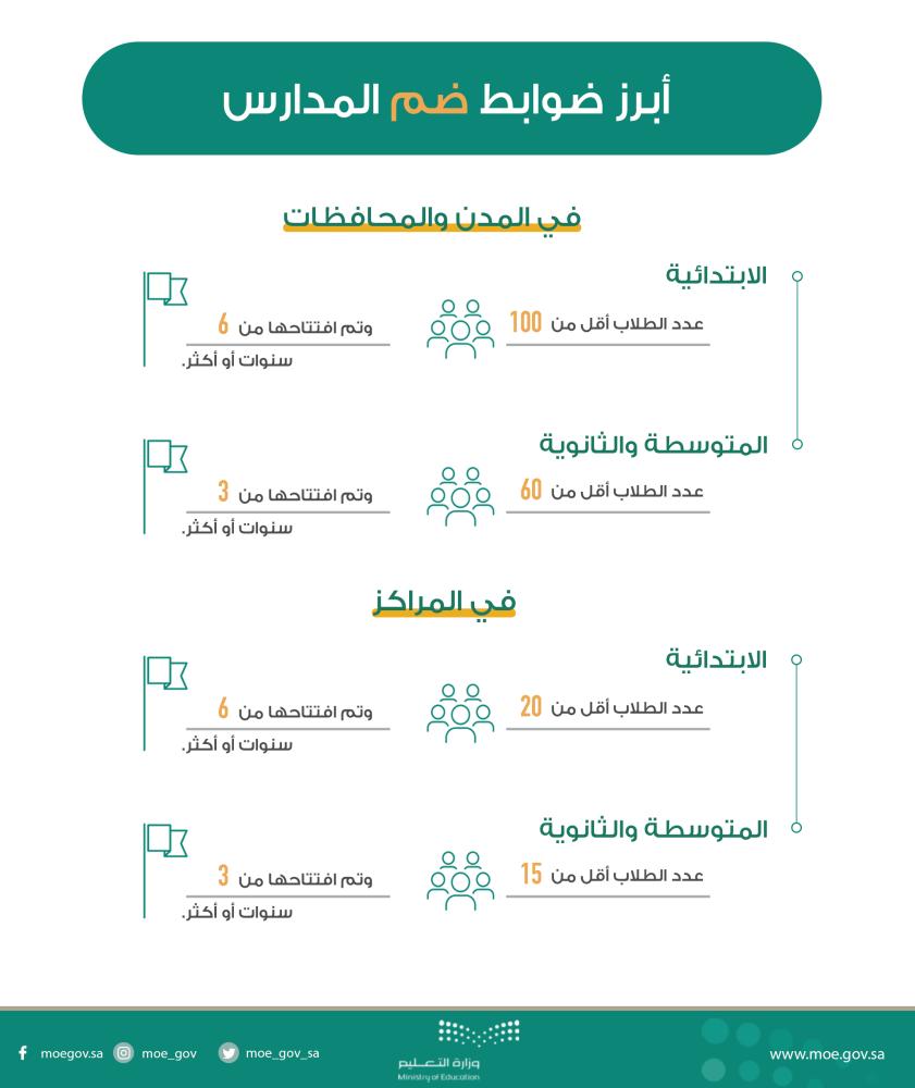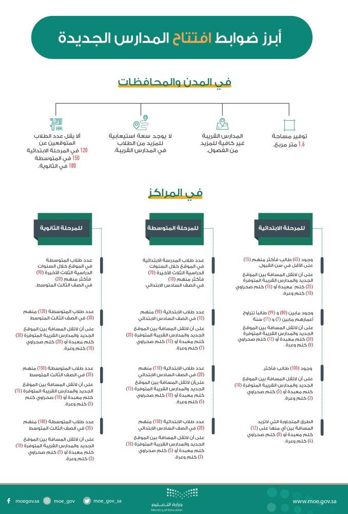 وتضمن القرار تفصيلات دقيقة حول ضوابط افتتاح المدارس أو ضمها وفق المراحل الدراسية المختلفة، إذ يراعي القرار الفارق في حجم الاحتياج للمدارس وفق المرحلة التعليمية ويتيح التنظيم الجديد لإدارات التعليم وإمارات المناطق تحديد مواقع المدارس في المراكز المتجاورة التي تعد موقعا واحدا في حال كانت المسافة بينها 12 كيلومترا بالطرق المعبدة أو 8 كيلومترات بالطرق الصحراوية، أو 4 كيلومترات بالطرق الوعرة. كما منح وزير التعليم إقرار مواقع المدارس حال لم يتحقق شرطا (المسافة، وعدد الطلاب) بعد تكوين لجنة من المختصين لزيارة الموقع المقترح.