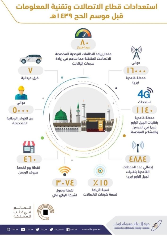 يذكر أن البنية التحتية للاتصالات وتقنية المعلومات في مكة المكرمة والمدينة المنورة والمشاعر المقدسة، تعد من أضخم البنى التحتية على مستوى العالم وأكثرها تقدماً، وتشمل هذه البنى التحتية المقاسم والكبائن والأبراج والمحطات اللاسلكية من الجيل الثاني والثالث والرابع لخدمة الملايين من ضيوف الرحمن.
