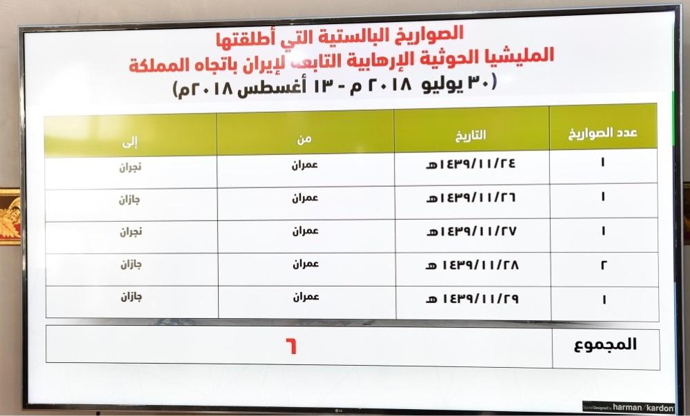 وفي الجانب العمليات العسكرية، بين المتحدث باسم قوات التحالف المشتركة أن المنطقة التي أطلق منها 6 صواريخ بتجاه مدينة جيزان من تاريخ 30 يوليو 2018 حتى 13 أغسطس 2018 من محافظة عمران.