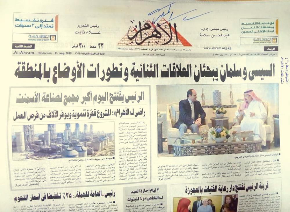 وأبرزت الصحف المصرية حفاوة استقبال خادم الحرمين الشريفين وولي العهد للرئيس السيسي في زيارته الاستثنائية لأول مرة بمدينة الأحلام السعودية الممتدة إلى داخل الأراضي المصرية والأردنية «نيوم»، وما تم تناوله خلالها من ملفات عدة إقليمية واقتصادية، إضافة إلى العلاقات الأخوية بين البلدين.
