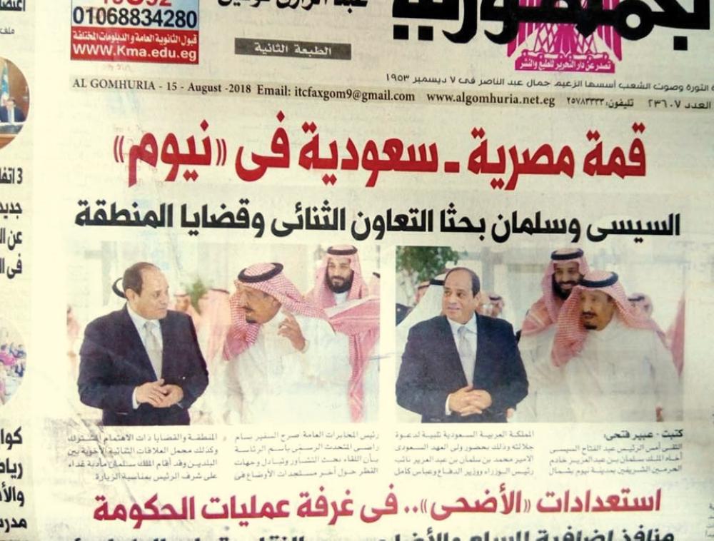 وتصدرت أخبار القمة السعودية ــ المصرية العناوين الرئيسية للصحف المصرية القومية والمستقلة والمعارضة في نسختها الورقية، حيث قالت صحيفة «الأهرام» العريقة في صفحتها الأولى «السيسي وسلمان يبحثان العلاقات الثنائية وتطورات الأوضاع في المنطقة»، وتصدرت الصفحة الأولى لصحيفة الجمهورية «قمة مصرية سعودية في نيوم»، وفي صحيفة الأخبار «قمة مصرية سعودية في نيوم.. السيسي يبحث مع سلمان الأوضاع في المنطقة والعلاقات الثنائية».