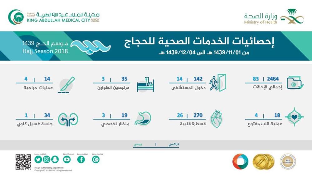 ارتفعت عمليات القلب في مدينة الملك عبدالله الطبية بالعاصمة المقدسة بنسبة ١٥٠% لحجاج بيت الله الحرام خلال الأربعة الأيام الأولى من شهر ذو الحجة مقارنة بالعمليات التي أجريت للحجاج في شهر ذو القعدة خلال حج هذا العام.