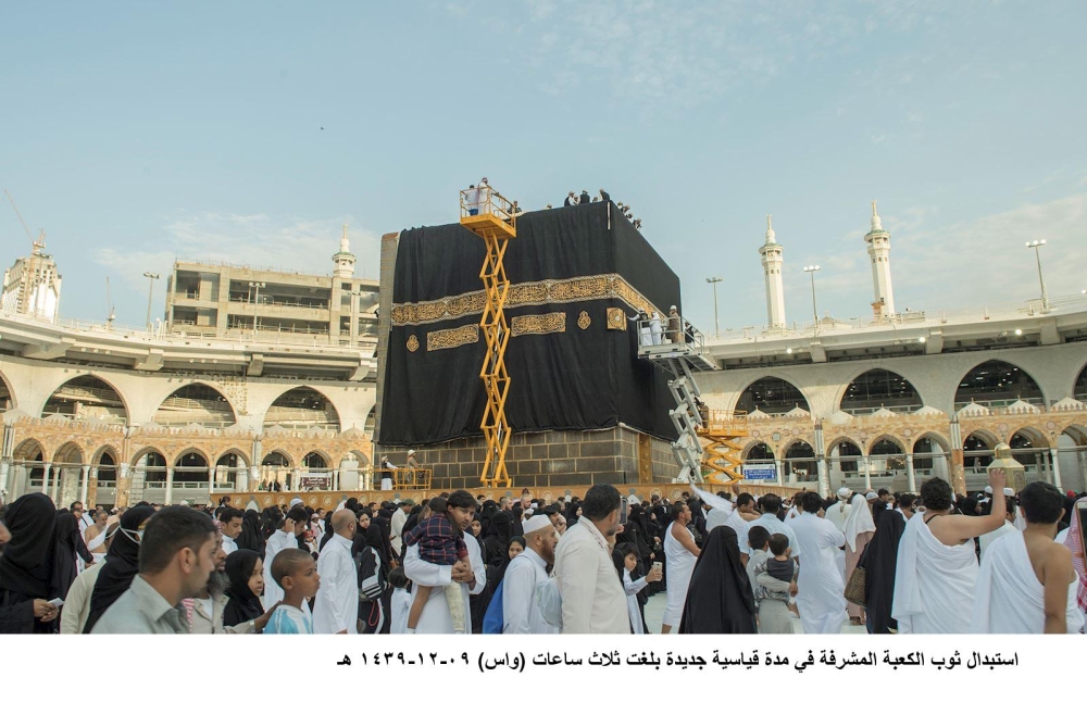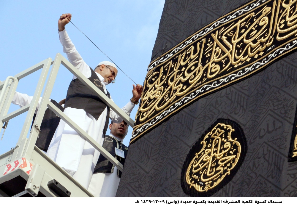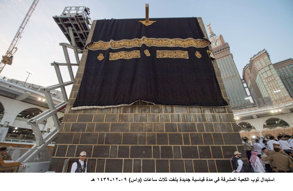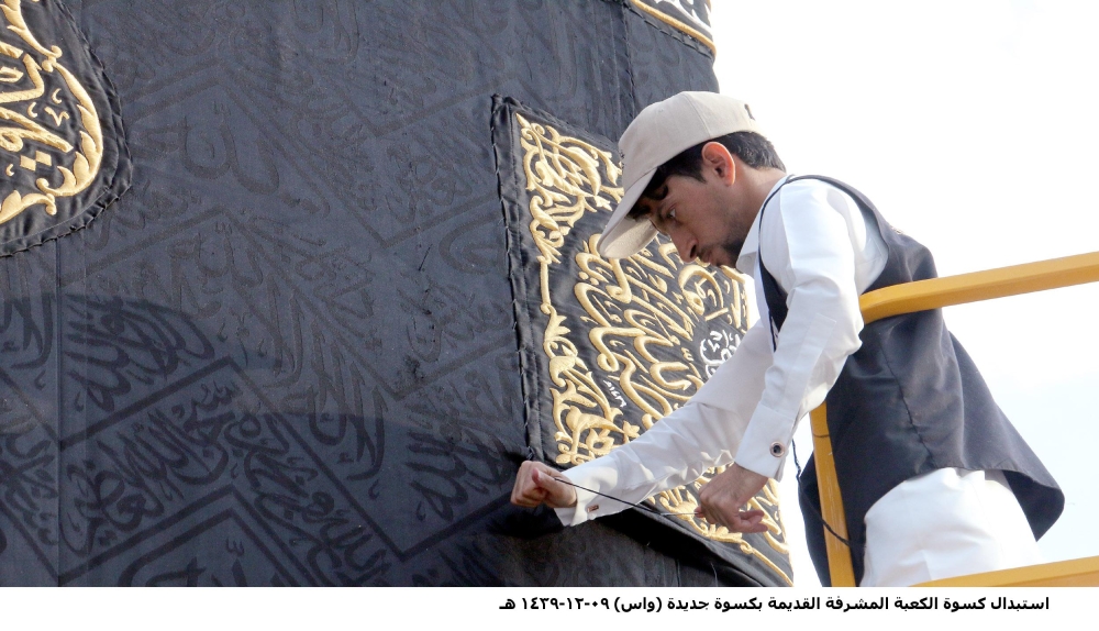 في كل عام وبعد صلاة فجر اليوم التاسع من شهر ذي الحجة، تبدأ مراسم استبدال كسوة الكعبة المشرفة على يد فنيين وصناع، إذ يتم استبدال كسوة الكعبة المشرفة القديمة بكسوة جديدة، بإشراف ومتابعة الرئيس العام لشؤون المسجد الحرام والمسجد النبوي الشيخ الدكتور عبدالرحمن السديس. وأبلغ مدير عام مجمع الملك عبدالعزيز لكسوة الكعبة المشرفة أحمد المنصوري أنه تم بعد أداء صلاة الفجر أمس التاسع من شهر ذي الحجة إنزال الكسوة القديمة للكعبة، وإلباسها الجديدة، المكونة من 4 جوانب مفرقة وستارة الباب. موضحا أن الكسوة تتوشح من الخارج بنقوش منسوجة بخيوط النسيج السوداء (بطريقة الجاكارد)، كتب عليها لفظ (يا الله يا الله)، (لا إله إلا الله محمد رسول الله)، (سبحان الله وبحمده)، (سبحان الله العظيم)، (يا ديان يا منان)، وتتكرر العبارات على قطع قماش الكسوة جميعها. وأفاد بأن عدد قطع حزام كسوة الكعبة المشرفة يبلغ 16 قطعة، إضافة إلى 6 قطع و12 قنديلا أسفل الحزام و4 صمديات توضع في أركان الكعبة و5 قناديل «الله أكبر» أعلى الحجر الأسود، إلى جانب الستارة الخارجية لباب الكعبة المشرفة.