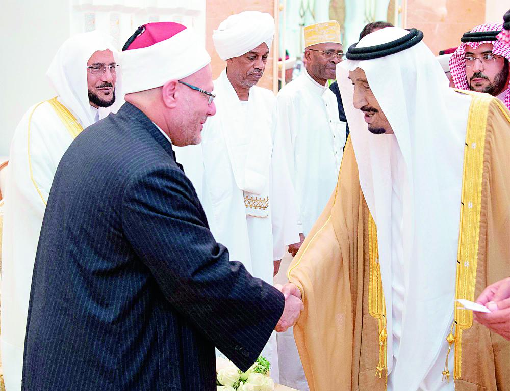 خادم الحرمين مصافحا مفتي مصر في حفل الاستقبال السنوي في منى أخيرا. (واس)