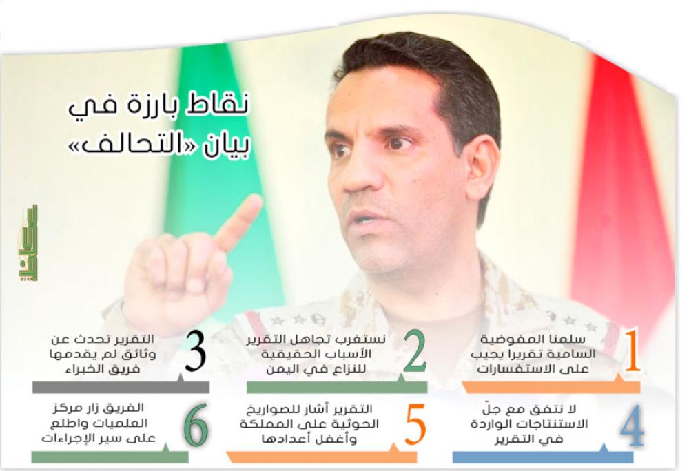 وقطع بعدم صحة الادعاءات والمزاعم الواردة في التقرير التي تتناول استهداف قوات التحالف للمدنيين والقيود المفروضة على وصول المساعدات الإنسانية وادعاءات الاحتجاز التعسفي والاختفاء القسري والتعذيب وسوء المعاملة وانتهاكات حرية التعبير والعنف الجنسي وتجنيد الأطفال، وقد استندت هذه الادعاءات على التقارير المضللة لبعض المنظمات غير الحكومية وما تنشره وسائل الاعلام، بالرغم من أنه سبق لدول التحالف أن فندت هذه الادعاءات والمزاعم خلال الاجتماعات مع فريق الخبراء الأممي وعبر الردود الرسمية التي تم تزويد الفريق بها، إلا أن الفريق وللأسف تجاهل تضمين هذه الردود في التقرير. الأمر الذي أفقد التقرير حياديته وتوازنه.
