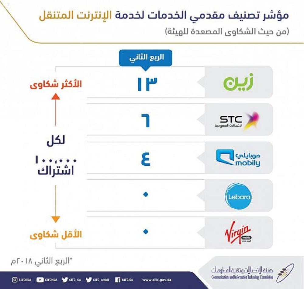 وحسب التصنيف، فقد تصدرت شركة الاتصالات المتنقلة السعودية «زين» قائمة الأكثر شكاوى في خدمات الاتصالات المتنقلة الصوتية بزيادة قدرت بـ 10% عن الربع الأول 2018م، كما جاءت «زين» في صدارة القائمة للشركات الأكثر شكاوى في خدمات الإنترنت المتنقل.