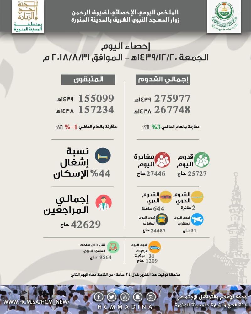 وسجل الإحصاء عدد الحافلات التي أقلت الحجاج لليوم نفسه 644 حافلة، وبلغ عددهم 24.487 حاجا، في حين بلغ عدد المركبات 31 مركبة أقلت 1209 حجاج، بينما بلغ عدد الحجاج الذين تم نقلهم عبر عربات النقل داخل ساحات المسجد النبوي 9564 حاجا.