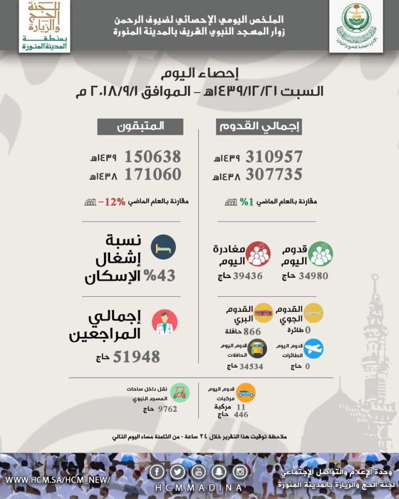 وبين الإحصاء أن عدد القدوم ليوم أمس، بلغ 34.980 حاجاً، فيما غادرها لليوم نفسه 39.436 مسافراً وبلغت نسبة إشغال الإسكان 43%، بينما بلغ إجمالي الحجاج المراجعين لمراكز الرعاية الصحية وأقسام الطوارئ والعيادات بالمستشفيات 51.948 حاجاً.