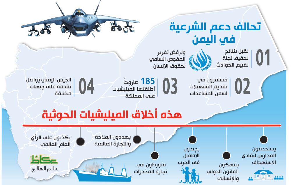 وجدد المتحدث باسم قوات تحالف دعم الشرعية في اليمن العقيد الركن تركي المالكي خلال المؤتمر الصحفي الأسبوعي الذي عقد أمس (الإثنين) رفض التحالف لتقرير مفوض الأمم المتحدة السامي لحقوق الإنسان لما تضمنه من مغالطات ومعلومات غير صحيحة، مؤكدا قيام التحالف بمراجعة قانونية للتقرير من خلال الإدارة القانونية بالتحالف وسيتم الرد من خلال القنوات الرسمية لمجلس حقوق الإنسان، مرحبا بموقف الحكومة اليمنية الرافض للتقرير الأممي.