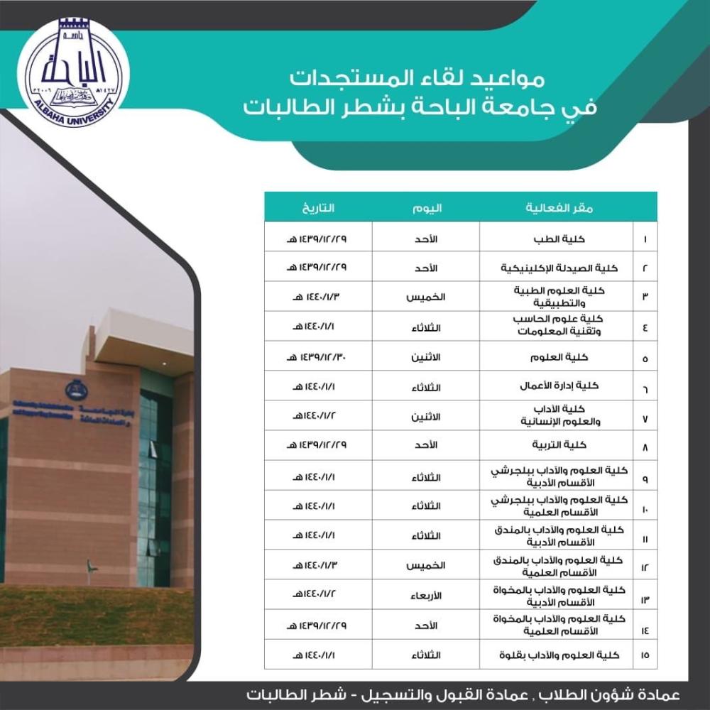 استقبلت جامعة الباحة أكثر من 3 آلاف طالبة في لقاء المستجدات في كليات البنات بالباحة والمندق وبلجرشي والمخواة وقلوة، عبر برنامج بعنوان «أعددنا لك» للعام الجامعي الحالي، وذلك بقسميها الأدبي والعلمي من الفترة 29 ذي الحجة وحتى 3 محرم 1440، من الفترة 9 صباحا طيلة فترة الأسبوع.