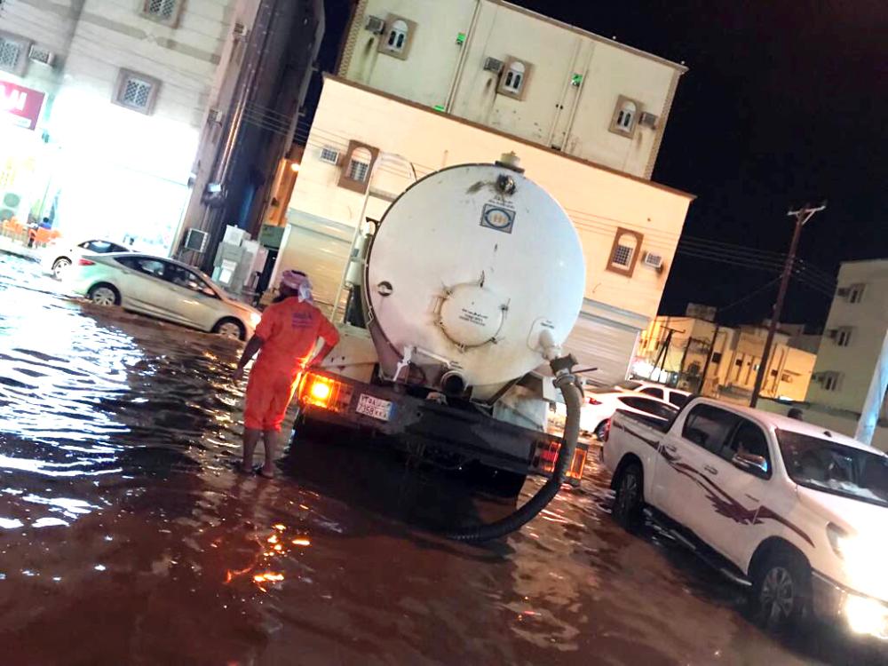 معدات البلدية تسحب المياه من شوارع صامطة. (عكاظ)