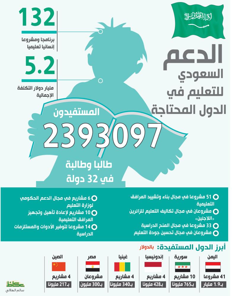 وقال في تصريح صحفي لوكالة الأنباء السعودية: إنه من هذا المنطلق قامت المملكة بدعم العملية التعليمية وتنفيذ البرامج والمشاريع في الدول المنكوبة، إذ بلغ عدد الطلاب والطالبات المستفيدين 2393097 طالبا وطالبة، موزعين على 32 دولة، بإجمالي 132 برنامجا ومشروعا إنسانيا تعليميا، بقيمة إجمالية بلغت 5 مليارات و212 مليونا و929 ألف دولار أمريكي، فيما بلغ عدد الشركاء 27 شريكا، منهم 4 شركاء من منظمات الأمم المتحدة، وهم: منظمة الأمم المتحدة للطفولة (اليونيسف)، ومنظمة الأمم المتحدة للتربية والثقافة والعلم (اليونيسكو)، وبرنامج الأمم المتحدة للمستوطنات البشرية، وبرنامج الغذاء العالمي.