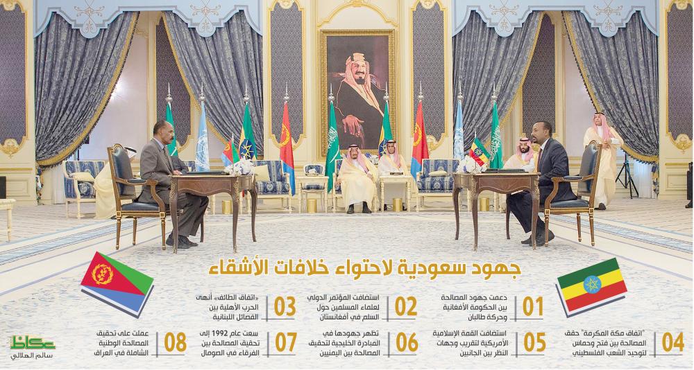 برعاية كريمة من خادم الحرمين الشريفين الملك سلمان بن عبدالعزيز، وقع كل من رئيس دولة إريتريا أسياس أفورقي، ورئيس وزراء إثيوبيا آبي أحمد علي، أمس (الأحد) اتفاق جدة للسلام بين جمهورية إثيوبيا الديموقراطية الاتحادية ودولة إريتريا، بحضور ولي العهد نائب رئيس مجلس الوزراء وزير الدفاع الأمير محمد بن سلمان بن عبدالعزيز.