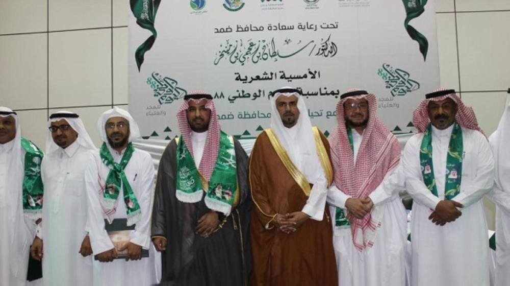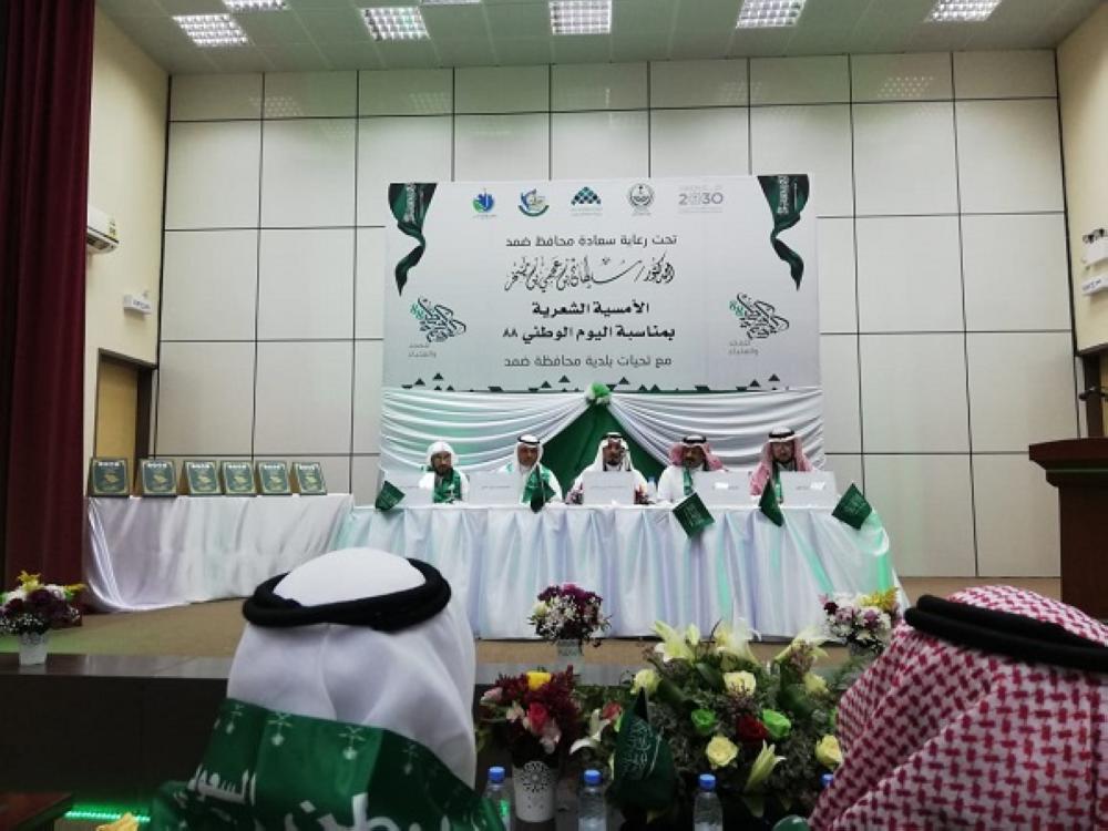 رعى محافظ ضمد الدكتور سلطان بن عجمي بن منيخر مساء الليلة أمسية الوفاء للوطن وقادته، التي نظمتها بلدية محافظة ضمد ضمن فعاليات الاحتفال باليوم الوطني الثامن والثمانين للمملكة العربية السعودية في صالة الاحتفالات بمعهد ضمد العلمي، وقد أحيا الأمسية شعراء ملتقى الإبداع الأدبي وهم الشاعر أحمد المتوكل بن علي النعمي، والشاعر حمد بن عبدالله العقيل، والشاعر محمد بن جابر مدخلي، والشاعر خالد بن حامد البار.