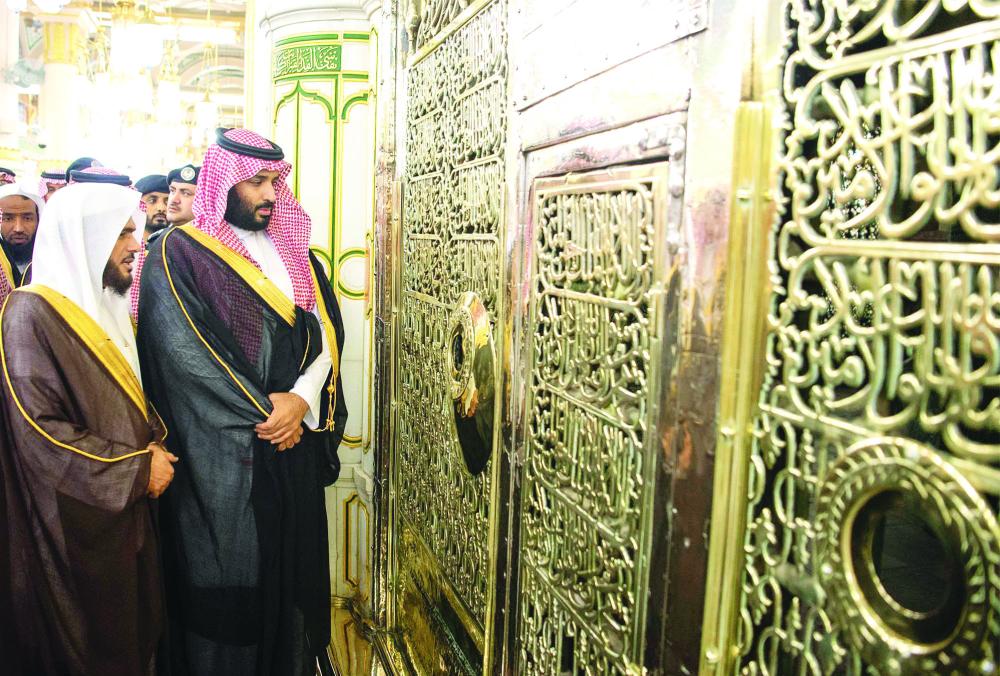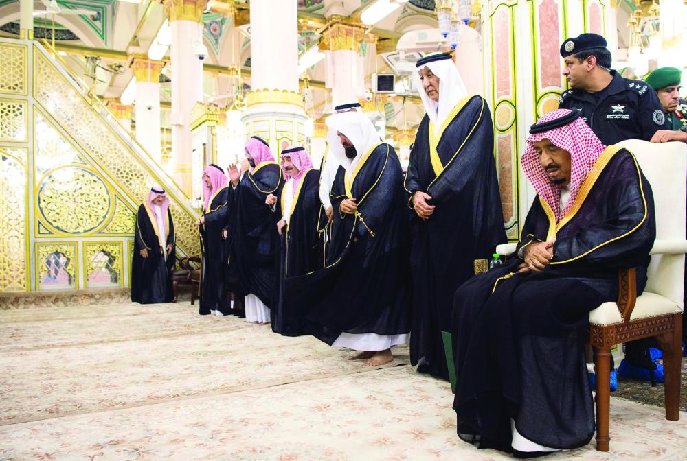 ولدى وصول الملك سلمان إلى الحرم النبوي يرافقه أمير منطقة المدينة المنورة الأمير فيصل بن سلمان بن عبدالعزيز، وولي العهد نائب رئيس مجلس الوزراء وزير الدفاع الأمير محمد بن سلمان بن عبدالعزيز، كان في استقباله الرئيس العام لشؤون المسجد الحرام والمسجد النبوي الدكتور عبدالرحمن بن عبدالعزيز السديس، وأئمة ومؤذنو المسجد النبوي، وقائد قوة المسجد النبوي اللواء عبدالرحمن المشحن، وعدد من المسؤولين. وأدى خادم الحرمين الشريفين، الصلاة في الروضة الشريفة، كما تشرف بالسلام على رسول الله صلى الله عليه وسلم، وعلى صاحبيه رضوان الله عليهما، بعدها تسلم هدية بهذه المناسبة.