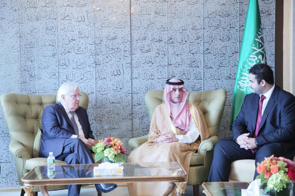 من جهة أخرى، استقبل وزير الخارجية في نيويورك مبعوث الأمين العام للأمم المتحدة إلى اليمن مارتن غريفيث، بحضور سفير خادم الحرمين الشريفين لدى الولايات المتحدة الأمريكية الأمير خالد بن سلمان بن عبدالعزيز.