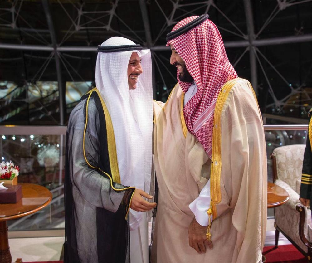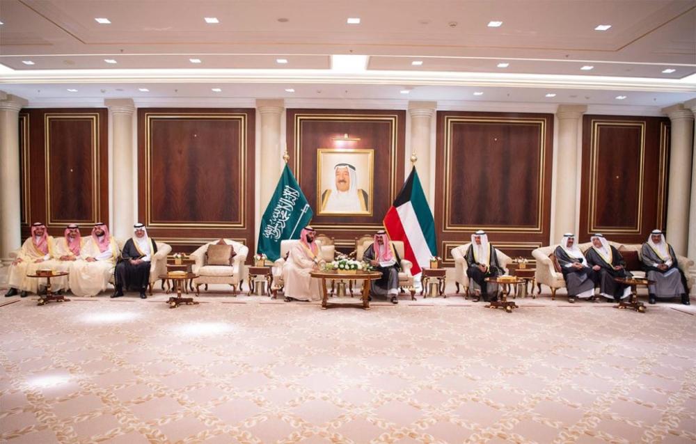 ويضم وفد ولي العهد سفير خادم الحرمين الشريفين لدى الكويت الأمير سلطان بن سعد بن خالد ، والمستشار بالديوان الملكي الأمير تركي بن محمد بن فهد بن عبدالعزيز، وأمير منطقة الجوف الأمير بدر بن سلطان بن عبدالعزيز ، ووزير الداخلية الأمير عبدالعزيز بن سعود بن نايف بن عبدالعزيز ، ووزير الثقافة الأمير بدر بن عبدالله الفرحان ، والمستشار بالديوان الملكي الأمير عبدالله بن خالد بن سلطان بن عبدالعزيز ، ونائب أمير منطقة نجران الأمير تركي بن هذلول بن عبدالعزيز ، ووزير الدولة عضو مجلس الوزراء الدكتور مساعد بن محمد العيبان، ووزير التجارة والاستثمار الدكتور ماجد القصبي، ووزير الخارجية عادل الجبير، ووزير الطاقة والصناعة والثروة المعدنية المهندس خالد الفالح، ووزير الإعلام الدكتور عواد العواد، ورئيس الاستخبارات العامة الأستاذ خالد الحميدان .
