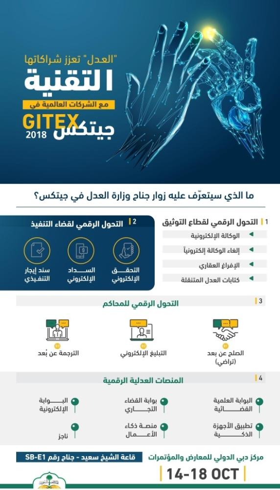 تشارك وزارة العدل رسمياً للعام الخامس على التوالي في معرض أسبوع جيتكس للتقنية 2018 في دبي خلال الفترة من 14 حتى 18 أكتوبر، عبر جناحها التفاعلي الذي يقدم خدمات إلكترونية ثرية تعكس التحول الرقمي في العمل العدلي، كما صُمم الجناح بشكل يحاكي البيئة العدلية القضائية في المملكة.