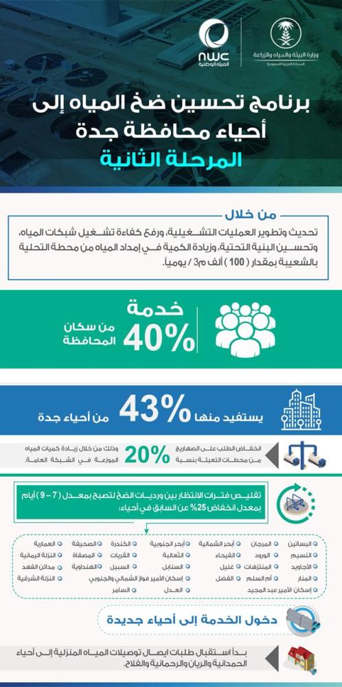 يذكر أن الشركة أطلقت قبل عدة أشهر المرحلة الأولى من البرنامج استفاد منها 11 حياً وهي:(البوادي-الفيصلية-الخالدية-المحمدية-النعيم–النهضة-الربوة-الروضة-السلامة-الشاطي-الزهراء)، وكانت هذه المرحلة قد حسّنت جداول وورديات الضخ بمعدل 15في المئة. كما نجحت الشركة في تحسين إمدادات المياه، وتقليل فترة انقطاعها في جداول ورديات الضخ في عدد من أحياء جنوب شرق محافظة جدة شملت (الأجاويد-السنابل-إسكان الأمير فواز الشمالي والجنوبي-إسكان الأمير عبد المجيد، والإسكان العام والعدل) بنسب وصلت إلى 50 في المئة.