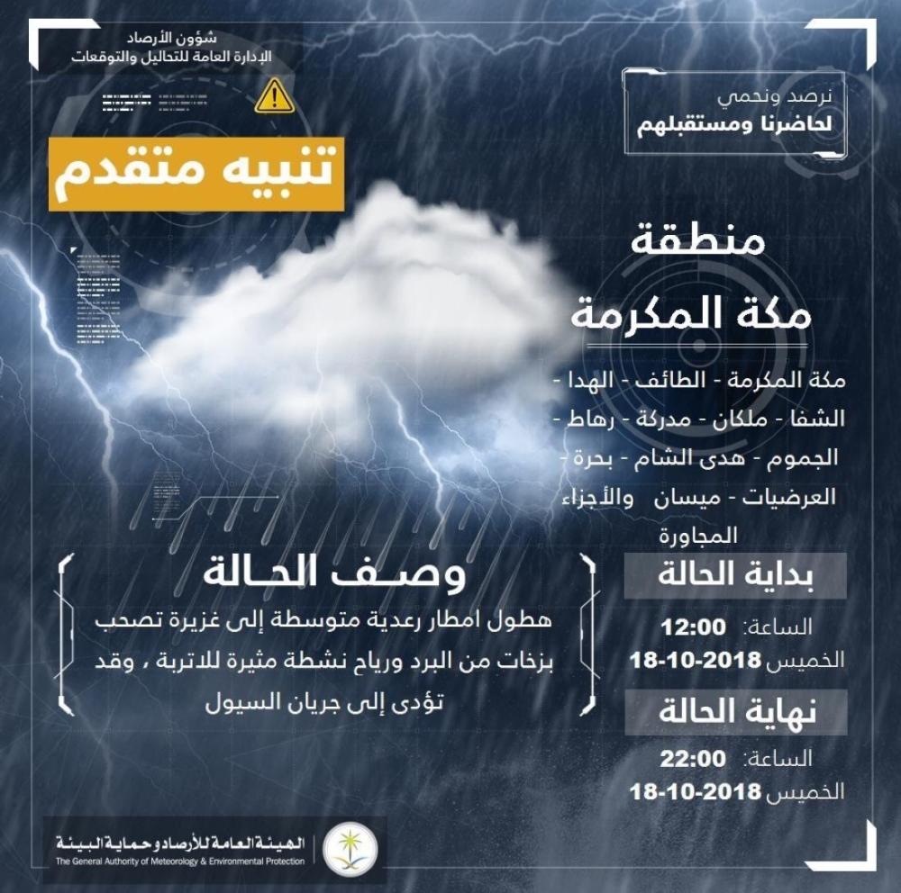 أصدرت الهيئة العامة للأرصاد وحماية البيئة اليوم (الخميس)، تنبيهاً متقدماً يتضمن هطول أمطار رعدية متوسطة إلى غزيرة تصحب بزخات من البرد ورياح مثيرة للأتربة، قد تؤدي إلى جريان السيول، مبينةً أن الحالة تشمل عدداً من محافظات ومراكز منطقة مكة المكرمة تشمل: الطائف، والهدا، الشفا، ملكان، مدركة، رهاط، هدى الشام، وميسان، والأجزاء المجاورة لها، مشيرة إلى أن الحالة تستمر إلى الساعة التاسعة مساء.