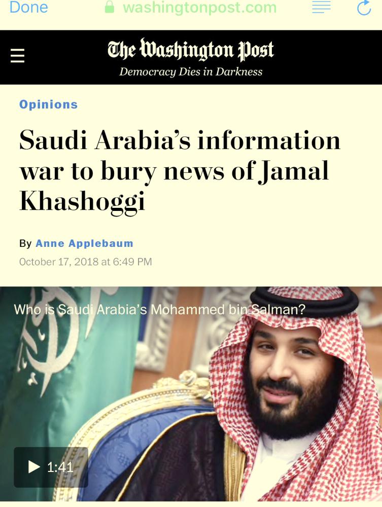 واختتمت الكاتبة المصدومة من هبّة السعوديين للذود عن وطنهم، بأن هذه الحسابات يقف خلفها شباب سعوديون يمتلكون هواتف محمولة ويشجعون على الوطنية.الكاتبة آن وغيرها من العاملين في الحقل الإعلامي والسياسي نسجوا قصة اختفاء جمال خاشقجي، لكن السعوديين أثبتوا لهؤلاء أن الوطنية شيء لا يُشترى. لذلك غيرت هذه الوسائل الإعلامية نهجها وبدأت في مهاجمة الشعب السعودي واتهامه بأنه منقاد بالوطنية.