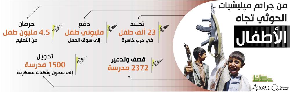 وتشير تقارير إحصائية إلى أن ميليشيات الحوثي الإرهابية التابعة لإيران قامت بتجنيد ما يزيد على 23 ألف طفل، بصورة مخالفة للاتفاقات الدولية، وقوانين حماية حقوق الطفل، منهم 2500 طفل منذ بداية العام الحالي 2018، وهي تجند الأطفال وتزج بهم في معاركها الخاسرة، بعد اختطافهم من المدارس والضغط على أسرهم وأولياء أمورهم لإرسالهم إلى جبهات القتال، وهو ما يمثل جرائم حرب، ومخالفة لكل القوانين الدولية الخاصة بالطفل.