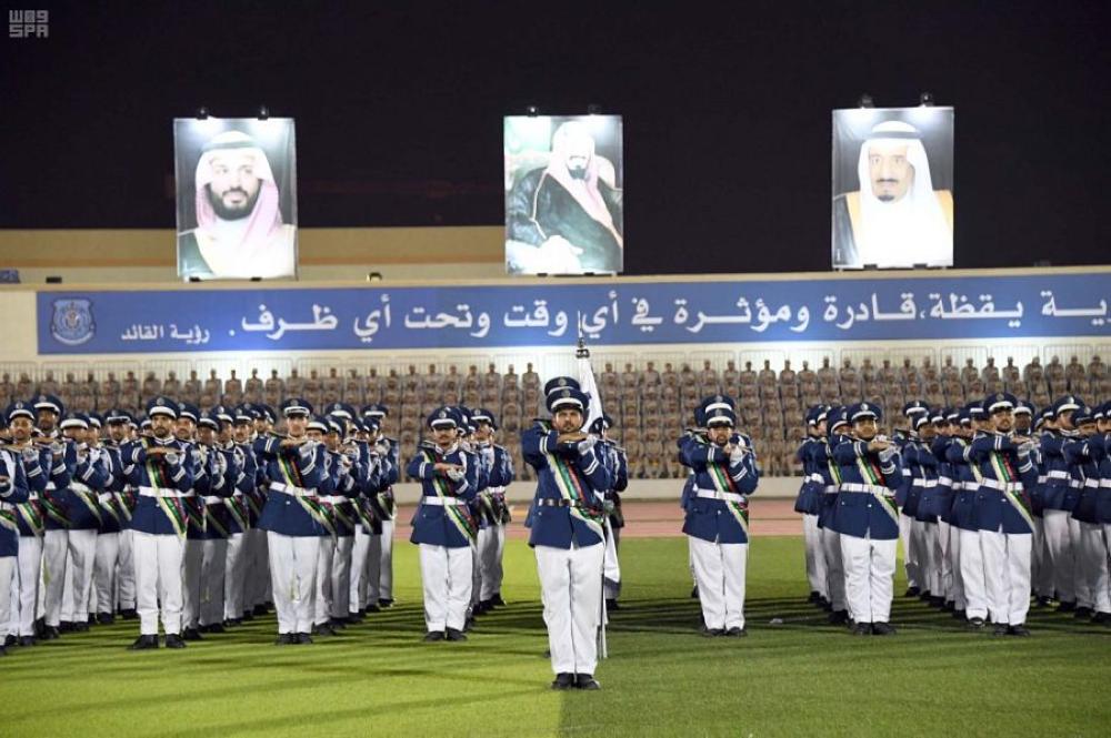 بعد ذلك تقدم قائد طابور العرض للاستئذان ببدء العرض العسكري حيث استعرض الخريجين واسراب الطلبة من أمام سمو قائد القوات الجوية والحضور والذي انتهى بتشكيل رائع لحدود وطننا الغالي من خلال قيام الطلبة بالوقوف صفاً واحداً على حدوده وفي داخل التشكيل عبارة «كلنا سلمان» ويعلوها شعار المملكة العربية السعودية السيفان والنخلة.