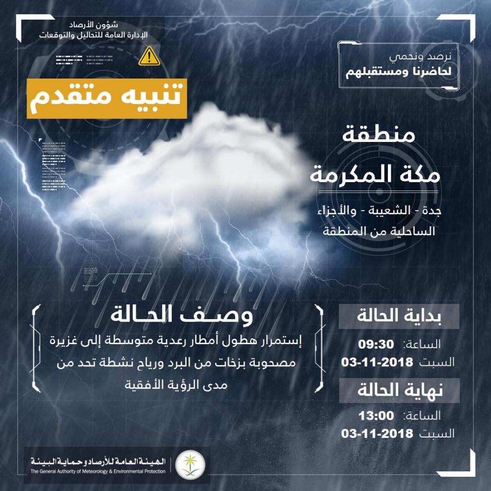 أصدرت الهيئة العامة للأرصاد وحماية البيئة تنبيهاً متقدماً لمنطقة مكة المكرمة يشمل (جدة، الشعيبة، والأجزاء الساحلية من المنطقة) عن استمرار هطول أمطار رعدية متوسطة إلى غزيرة مصحوبات بزخات من البرد ورياح نشطة تحد من مدى الرؤية الأفقية.