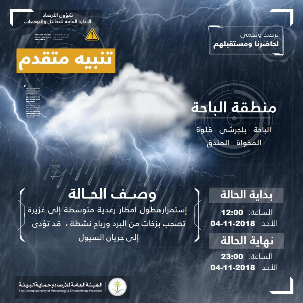 كما أطلقت «الأرصاد» أيضا تنبيها متقدما عن حالة الطقس في محافظات الباحة، بلجرشي، قلوة، المخواة والمندق يفيد بهطول أمطار رعدية متوسطة إلى غزيرة تصحب بزخات من البرد ورياح نشطة مثيرة للأتربة، وقد تؤدي إلى جريان السيول. حيث تبدأ الحالة من الساعة 12 ظهراً وتستمر إلى 11 مساء.