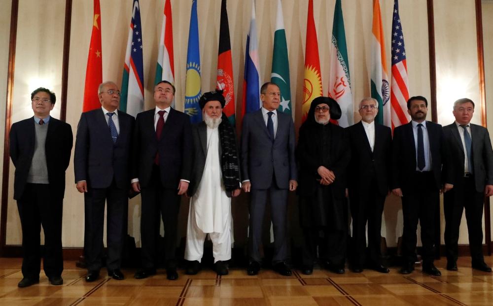 لافروف في صورة مع أعضاء الوفود خلال محادثات السلام متعددة الأطراف حول أفغانستان. (رويترز)