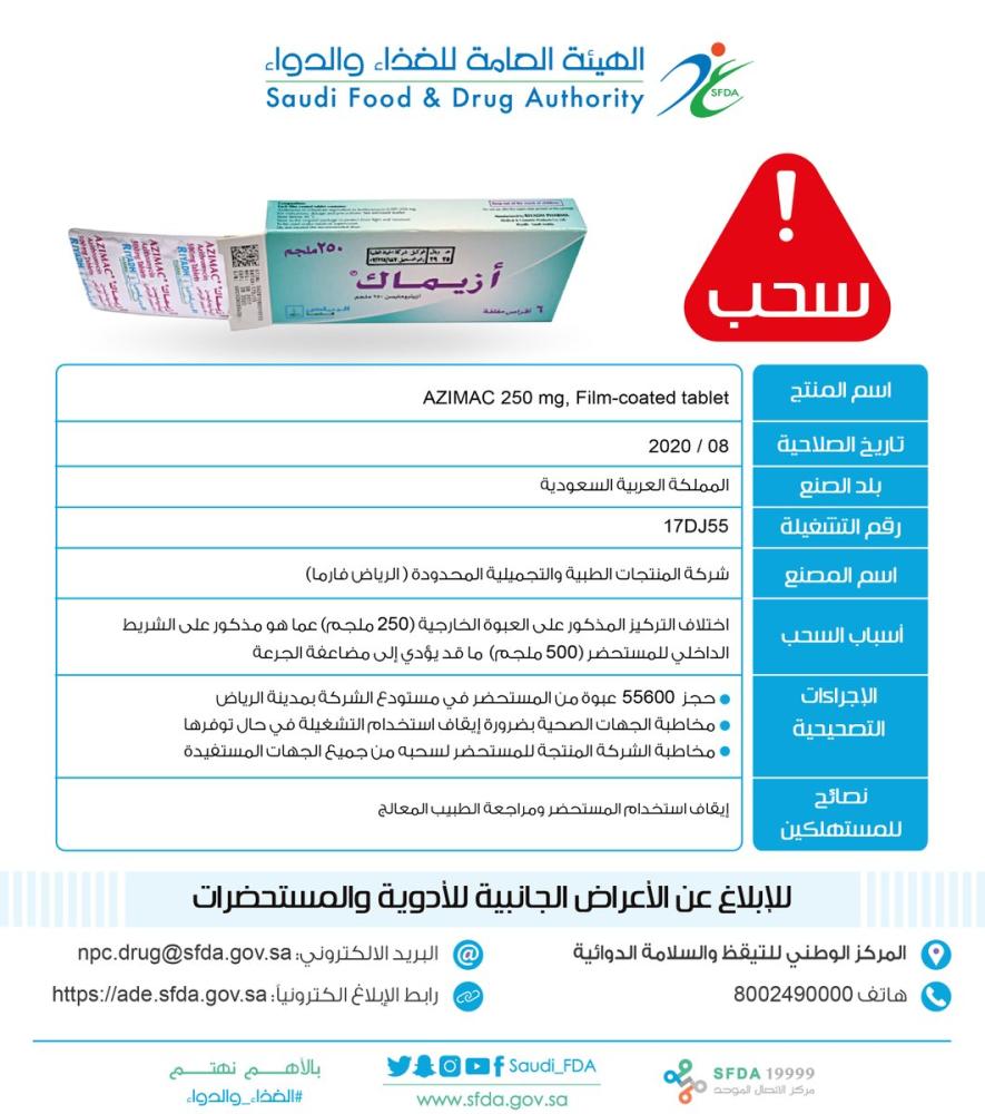 أصدرت الهيئة العامة للغذاء والدواء، تعميماً لجميع الجهات الصحية بضرورة إيقاف استخدام التشغيلة رقم 17DJ55 من مستحضر AZIMAC 250 mg, Film-coated tablet، الذي تنتجه شركة المنتجات الطبية والتجميلية المحدودة (الرياض فارما) بالمملكة العربية السعودية، وذلك بسبب اختلاف التركيز المذكور على العبوة الخارجية (250 ملغم) عما هو مذكور على الشريط الداخلي للمستحضر (500 ملغم) ما قد يؤدي إلى مضاعفة الجرعة.