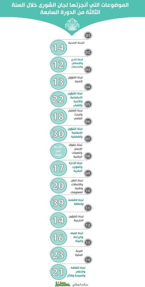 أنجزت لجنة الاقتصاد والطاقة دراسة (39) موضوعاً، من بينها مشروع نظام الرهن التجاري، ومشروع نظام المهن الحرة، ومشروع نظام الشركات المهنية، ومشروع نظام التجارة الإلكترونية.