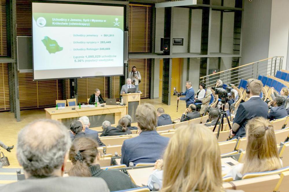 بعدها نقل الدكتور عبدالله الربيعة للحضور تحيات خادم الحرمين الشريفين، وولي عهده الأمين، معربا عن سعادته بوجوده في جمهورية بولندا الصديقة، مفيدا بأن التوجيهات الكريمة صدرت من لدن خادم الحرمين الشريفين بإنشاء مركز الملك سلمان للإغاثة والأعمال الإنسانية في 13 مايو 2015، ليكون الذراع الإنسانية للمملكة في الخارج ضمن مبادئ ترتكز على تقديم المساعدات الإنسانية بحياد ودون تمييز وبأعلى مستوى من الاحترافية. وأبان أن مركز الملك سلمان للإغاثة نفذ منذ إنشائه 482 مشروعا في 42 دولة، بقيمة مليار و924 مليونا و553 ألف دولار، خصصت 86% منها لليمن بقيمة مليار و659 مليونا و271 ألف دولار. وعن المشاريع المخصصة للأسرة أوضح الربيعة أن المركز نفذ 206 مشاريع للمرأة بقيمة 341 مليونا و481 ألف دولار، و171 مشروعا للطفل بقيمة 504 ملايين و962 ألف دولار. وأفاد بأن المملكة تحتضن 561911 زائرا (لاجئا) يمنيا، و283449 زائرا (لاجئا) سوريا، و249669 زائرا (لاجئا) مينماريا، بما يعادل 5.36% من مواطني المملكة، وهي بذلك تحتل المرتبة الثانية عالميا من حيث عدد المهاجرين.