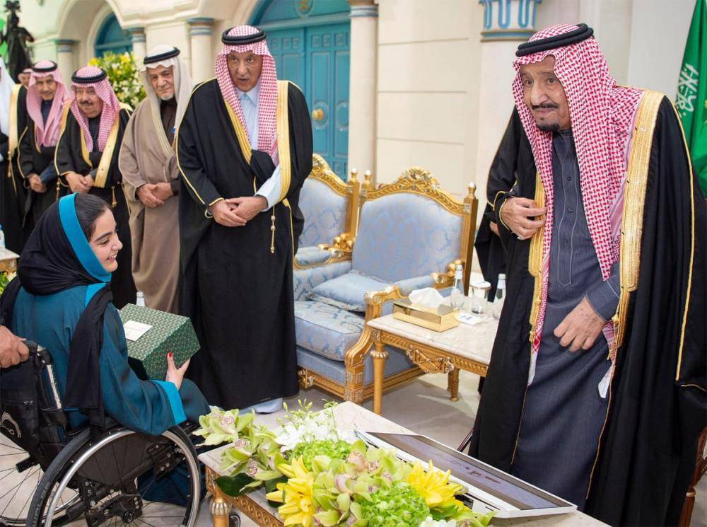ثم تفضل خادم الحرمين الشريفين بتكريم المتميزين من منطقة الجوف، وتسليمهم جوائزهم، وهم : مؤسسة عبدالرحمن بن أحمد السديري، وتسلمها الدكتور زياد بن عبدالرحمن السديري، التي تهدف لنشر الدراسات والإبداعات الأدبية ودعم الأبحاث ورسائل العلمية، الطالبة غلا بنت عبدالله الخلف الشاعل الحائزة على لقب أصغر سفيرة لمبادرة (10KSA) الخاصة بمحاربي سرطان الثدي، ولقب سفيرة المؤتمر الخامس للإعاقة والتأهيل 2018 برعاية خادم الحرمين الشريفين.