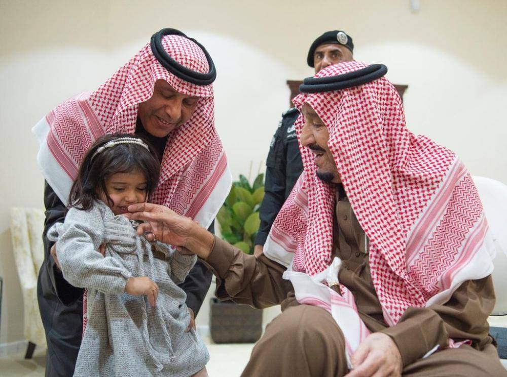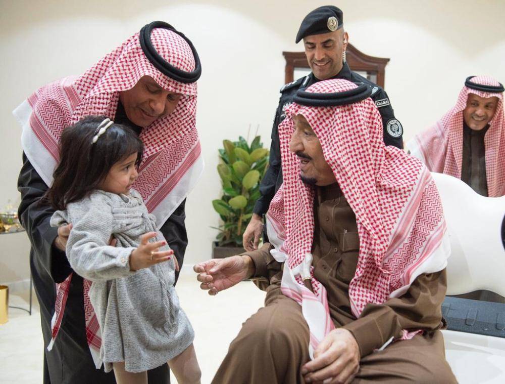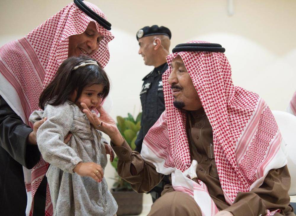 فور مشاهدتها له، أشرعت يديها لاحتضانه وهي تجري، ناسية كل دموعها المحملة بأماني لقاء خادم الحرمين الشريفين، التي لجّت بها مواقع التواصل الاجتماعي، بعد أن لبى لها الملك سلمان أمنيتها بلقائه.