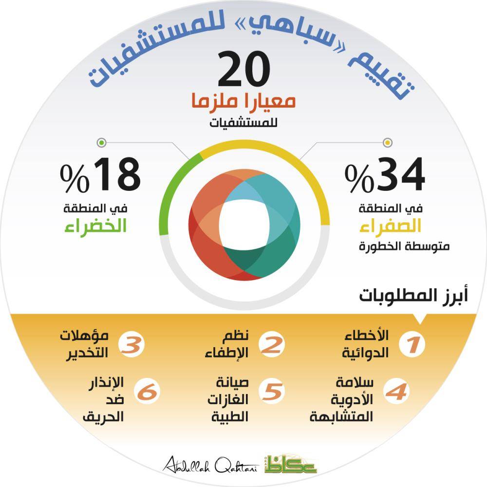 علمت «عكاظ» من مصادرها، أن المركز السعودي لاعتماد المنشآت الصحية (سباهي)، وضع نحو 44 % من مستشفيات وزارة الصحة داخل «المنطقة الحمراء» (خطر عالي، خطر وشيك)، و34 % في المنطقة الصفراء متوسطة الخطورة، و18 % فقط في المنطقة الخضراء، وهي المنشآت الصحية التي لم تستوف 6 معايير فأكثر من 20 متطلباً أساسياً لسلامة المرضى في برنامج المتطلبات الأساسية لسلامة المرضى (أمان) للعام 2018. وتضمن التقييم 227 من مستشفيات وزارة الصحة بين عالية ومتوسطة الخطورة، و51 مستشفى حكوميا قليل الخطورة، وتمثلت المطالب الأساسية الوطنية لسلامة المرضى، بالتحقق من صحة المؤهلات، والتعرف الصحيح على المريض، ولجنة مراقبة العدوى، والإبلاغ عن الأخطاء الدوائية، ونظم إطفاء الحريق، ومخارج الطوارئ، والتبرع بالدم، وغرف العزل، ومنع الخطأ في مكان الجراحة، والامتيازات السريرية، ونقل الدم الآمن، ومؤهلات فريق التخدير، وسلامة الأدوية الخطرة، والسلامة من الإشعاع، وحصر الحريق والدخان، والجلطات الوريدية، والتخدير المتوسط، وسلامة الأدوية المتشابهة، ونظم الإنذار ضد الحريق، وصيانة الغازات الطبية.