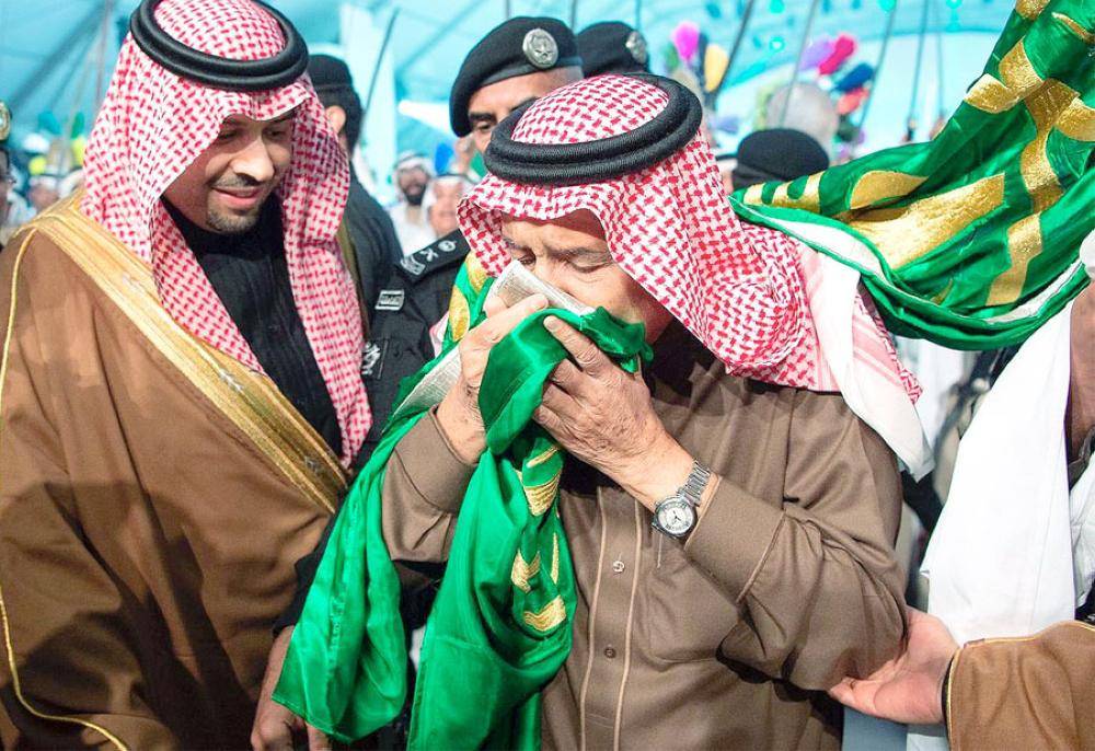 وأضاف «من هنا، وعبر خطوات الماضي المطمئن على درب زبيدة، وصولا إلى وعد الشمال، ومعانقة لمستقبل الآمال.. نملأ الأرض والسماء، بأريج الدعاء، وأنقى الترحيب والثناء، بمنزلتكم الأسمى، ومقامكم الأسنى، وبولي عهدكم القوي الأمين، عراب الرؤية، التي تتبوأ بها بلادنا مدارج المجد والسؤدد والتمكين».
