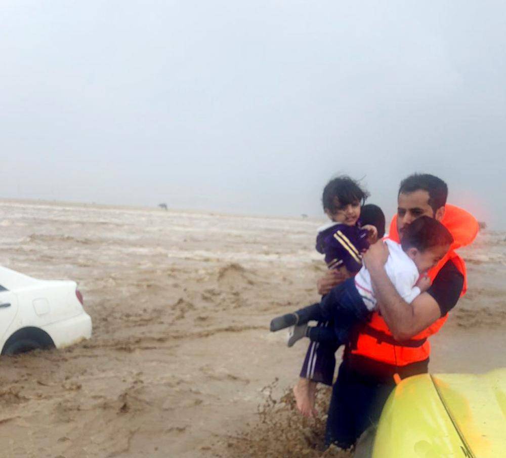 فيما أخلى طيران الأمن، أمس (الجمعة)، 3 محتجزين بواسطة سلة الإنقاذ ورفعهما إلى الطائرة بعد أن علقا فوق سيارتهما المحاصرة بمياه الأمطار من وسط سيل وادي الليث، أنقذت فرق الإنقاذ بالدفاع المدني في المحافظة 11 محتجزاً على طريقي الساحل الدولي القديم والجديد بعد أن داهمتهم السيول المنقولة من شرق ميقات يلملم على الطريق الدولي. وتسبب ارتفاع منسوب المياه وجريان المياه من أعلى السد في فيضانات، ما استدعى إجلاء عدد من المواطنين. ووفقاً لشهود عيان، فإن مياه السد تدفقت بكميات كبيرة بعد تحطم الحاجز الترابي لوادي الليث، ما أدى لدخول السيول الأجزاء الشرقية من المحافظة.
