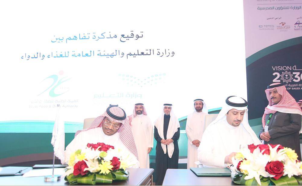 جانب من توقيع مذكرة التفاهم بين التعليم والغذاء والدواء. (عكاظ)