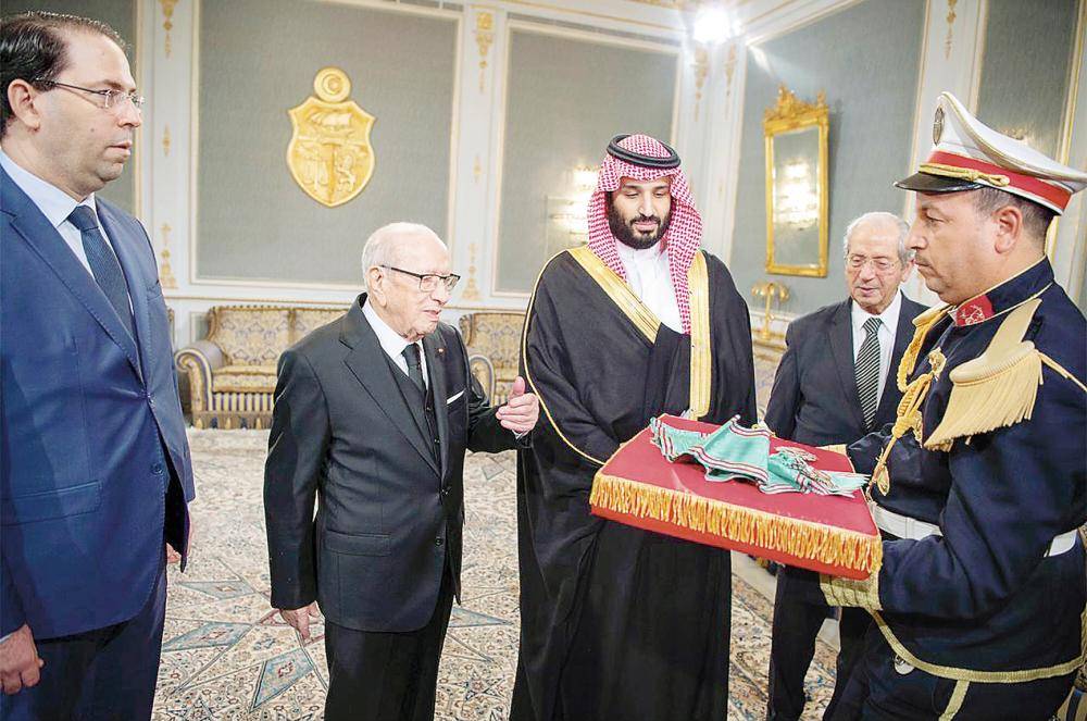 ومنح الرئيس التونسي الصنف الأكبر من وسام الجمهورية لولي العهد، تقديرا لجهوده في دعم وتعزيز العلاقات السعودية التونسية. وكان ولي العهد وصل مساء أمس الأول، إلى الجمهورية التونسية، واستقبله في المطار الرئاسي في العاصمة تونس، رئيس الجمهورية التونسية الباجي قايد السبسي، والوزراء، وكبار المسؤولين في الحكومة التونسية.