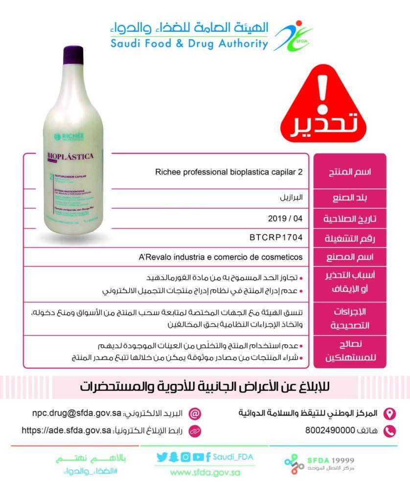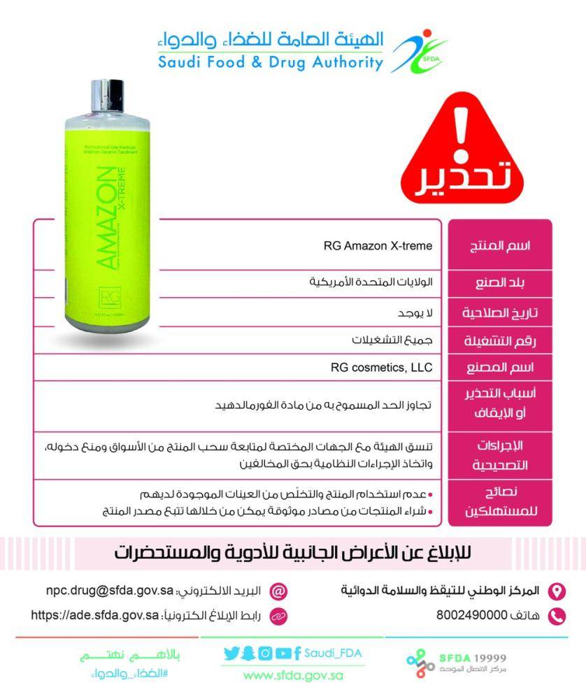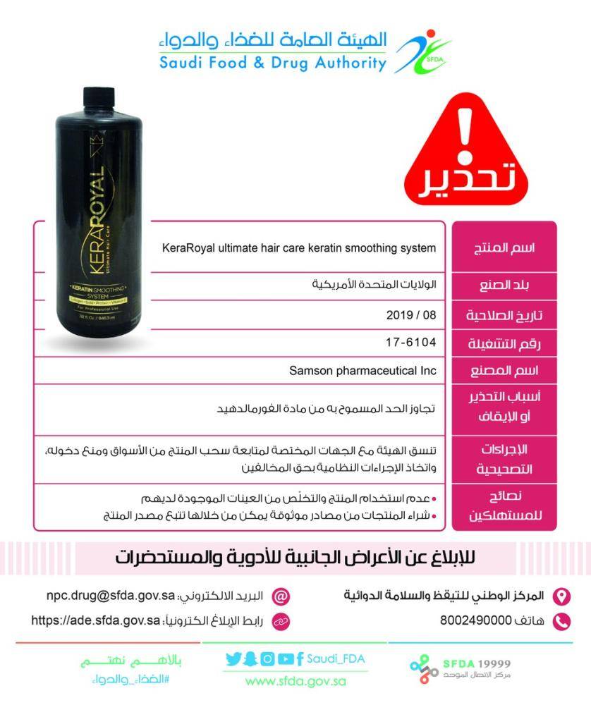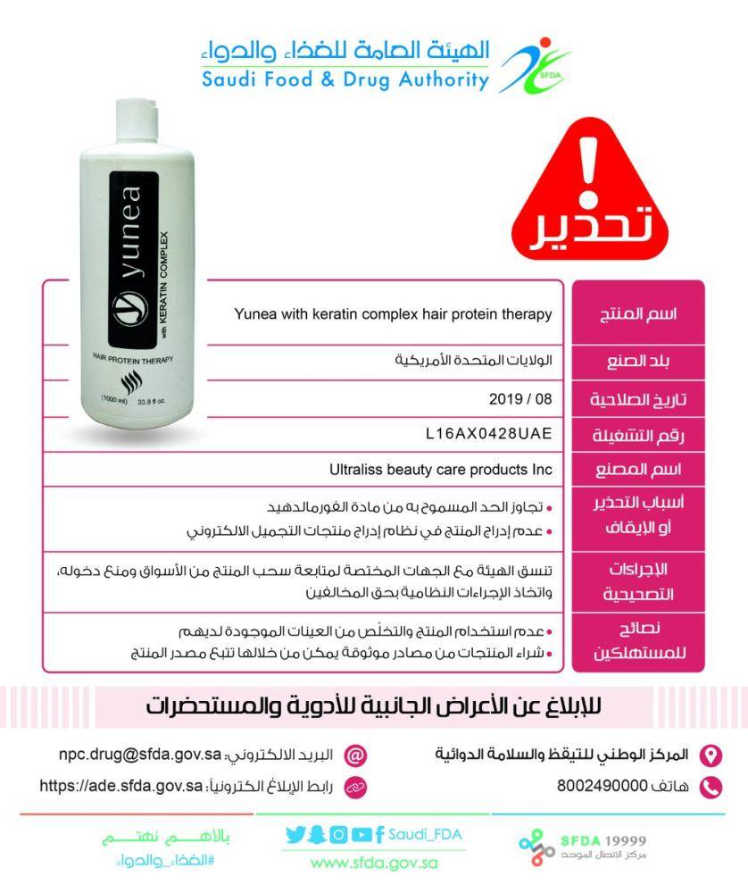 وأشارت «الغذاء والدواء» إلى أن المنتج الأول يحمل اسم «Yunea with keratin complex hair protein therapy» وصُنع في الولايات المتحدة الأمريكية برقم تشغيلة (L16AX0428UAE) وتاريخ صلاحيته 08 / 2019.، أما المنتج الثاني، فهو «Richee professional bioplastica capilar 2» وصُنع في البرازيل برقم تشغيلة (BTCRP1704) وتاريخ صلاحيته 04 / 2019، في حين يحمل المنتج الثالث اسم «RG Amazon X-treme» وصُنع في الولايات المتحدة الأمريكية ولجميع التشغيلات، ويحمل المنتج الرابع اسم «KeraRoyal ultimate hair care keratin smoothing system» وصُنع في الولايات المتحدة الأمريكية برقم تشغيلة (17-6104) وتاريخ صلاحيته 08 / 2019.