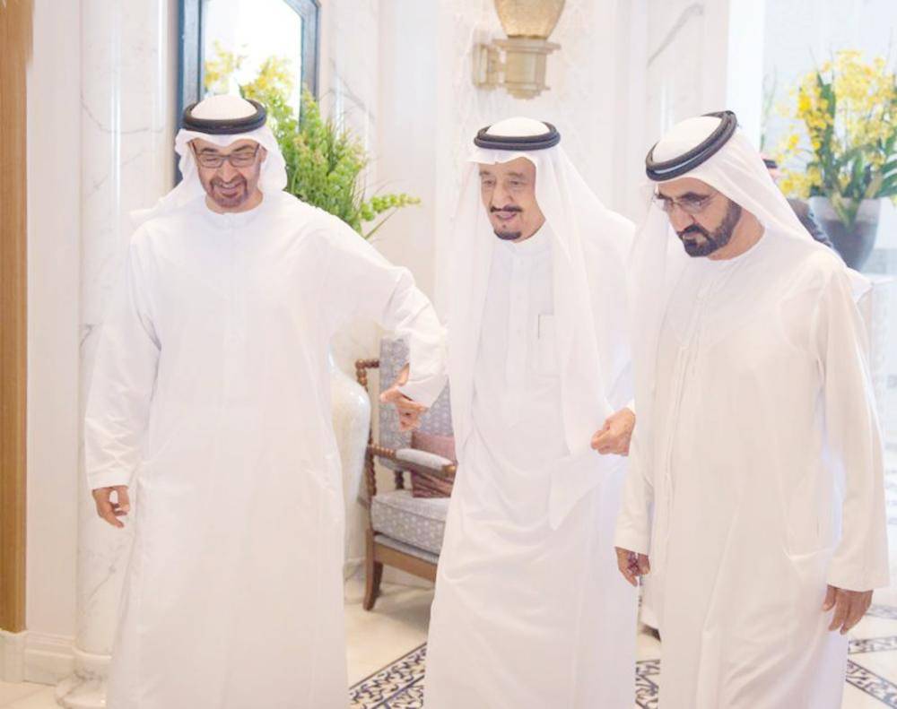 الملك سلمان ممسكاً بيدي أخويه الشيخ محمد بن راشد والشيخ محمد بن زايد في لقاء سابق.