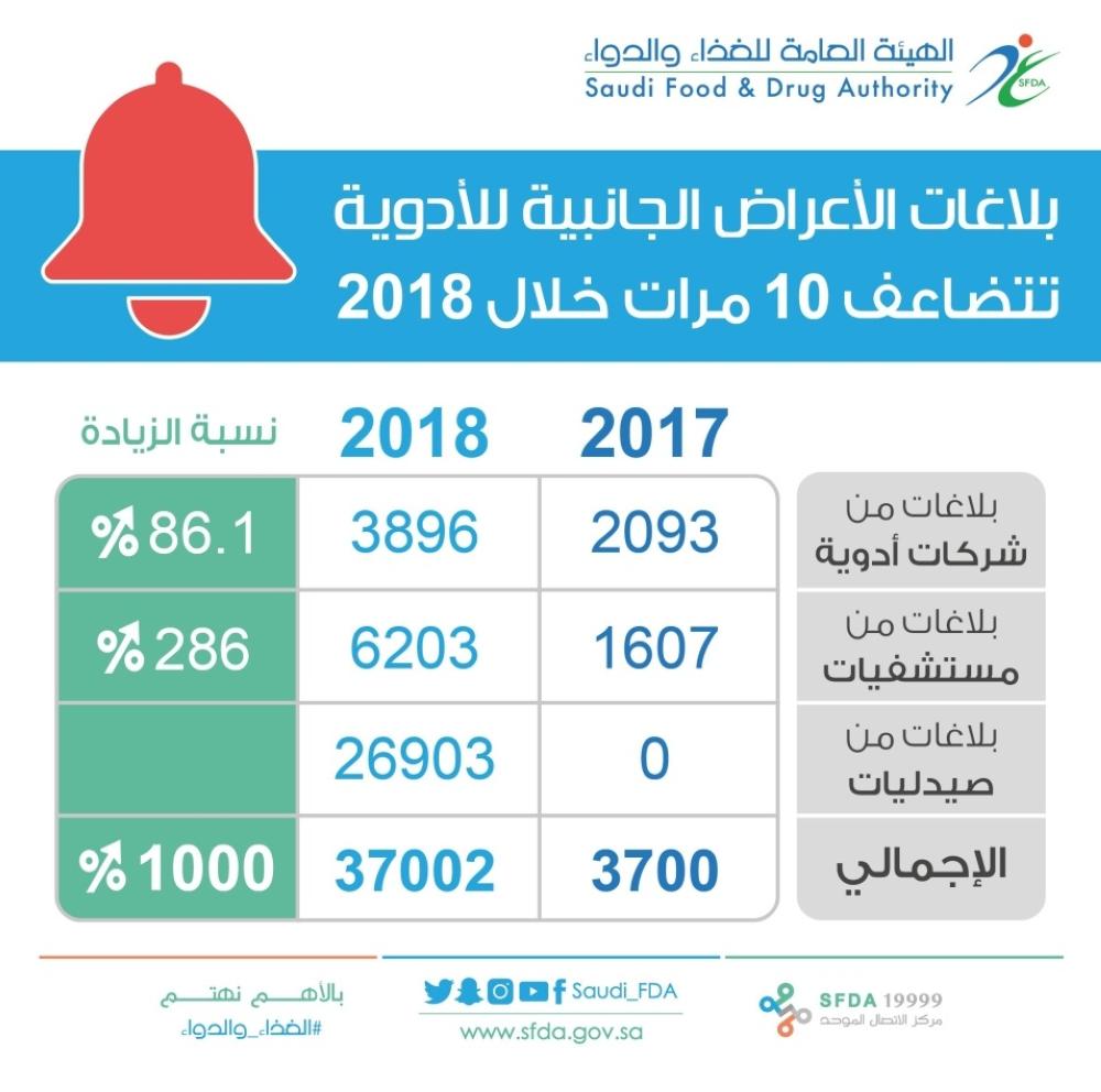 تضاعف عدد بلاغات الأعراض الجانبية للأدوية الواردة للهيئة العامة للغذاء والدواء 10 أضعاف (37002) منذ بداية العام الحالي حتى 2018/11/15، مقارنةً بـ3700 بلاغ عام 2017.