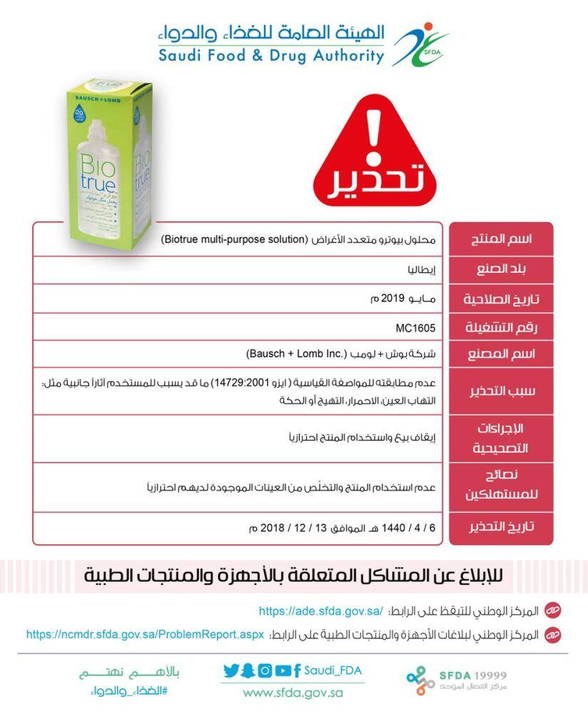 حذّرت الهيئة العامة للغذاء والدواء، من استخدام التشغيلة (MC1605) من محلول «بيوترو متعدد الأغراض» (Biotrue multi-purpose solution)، لاحتمال تسببه ببعض الآثار الجانبية للمستخدم مثل التهاب العين والاحمرار والتهيج والحكة.