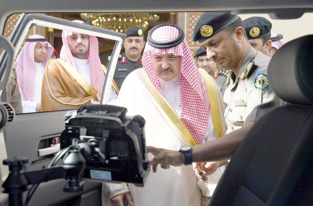 الأمير مشعل بن ماجد مطلعا على المركبة المزودة بنظام الرصد الآلي.