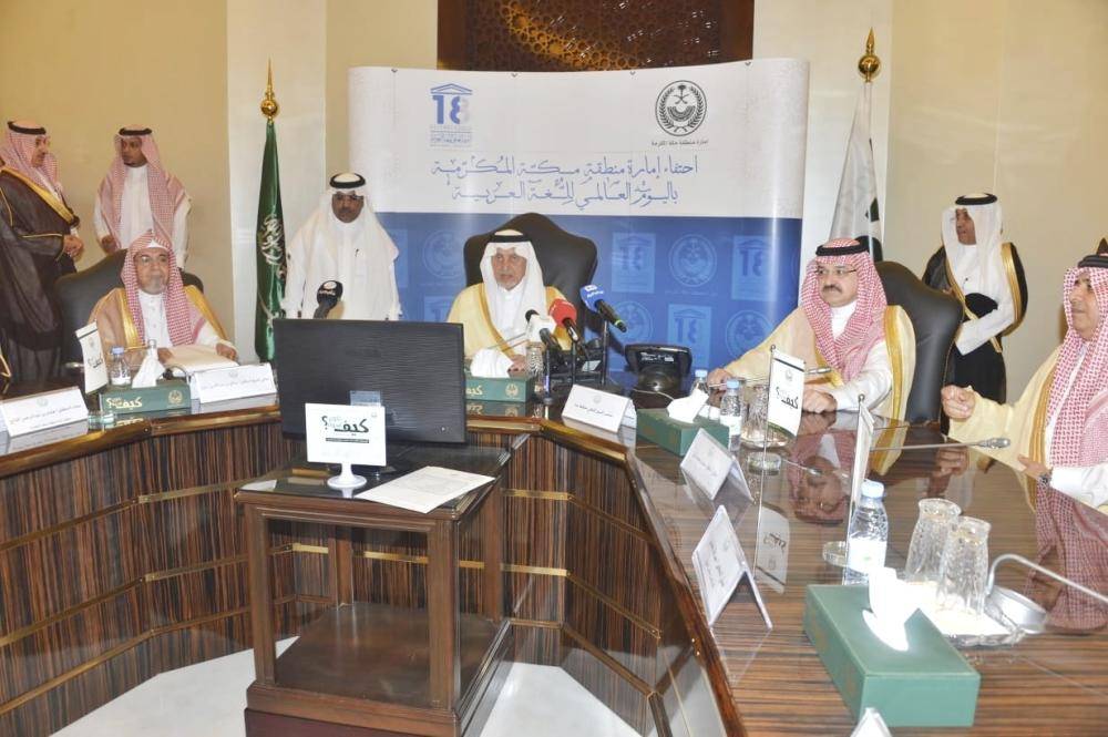 وقال أمير منطقة مكة المكرمة في كلمة بهذه المناسبة: «لقد كرمنا الله بأن تكون لغة أخر الكتب السماوية بلغتنا، وبعث فينا ومن الأمة العربية آخر رسله محمد صلى الله عليه وسلم، كما أن مصدر الشرف والفخر لنا مجاورة بيته العتيق ومسجد رسوله الكريم، وهذه الأمور تحتم علينا العناية باللغة العربية والاحتفاء بها، فهي اللغة الوحيدة التي لاتزال تستخدم كما جاءت في أصلها وهي اللغة أيضاً التي لم تنبثق عن لغات أخرى».