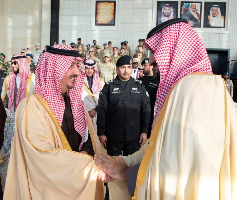 ولدى وصول ولي العهد يرافقه نائب أمير منطقة الرياض الأمير محمد بن عبدالرحمن بن عبدالعزيز وأمير منطقة الجوف الأمير بدر بن سلطان بن عبدالعزيز ووزير الداخلية الأمير عبدالعزيز بن سعود بن نايف بن عبدالعزيز، كان في استقبال ولي العهد، رئيس هيئة الأركان العامة الفريق أول ركن فياض الرويلي و قائد القوات الجوية الفريق طيار ركن تركي بن بندر بن عبدالعزيز، وقائد كلية الملك فيصل الجوية اللواء الطيار ركن خالد اللعبون.