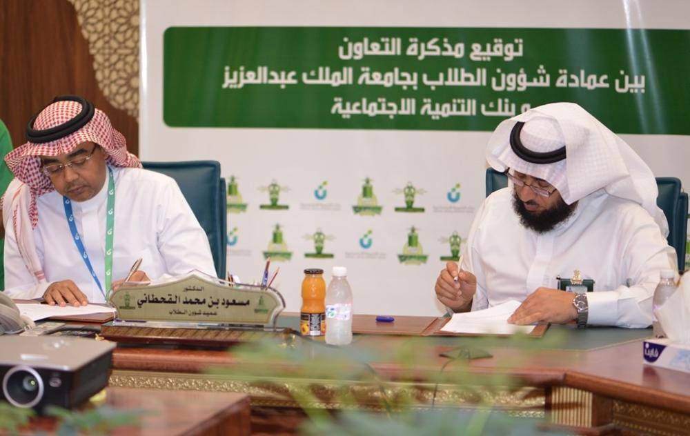 ومثل الجامعة في التوقيع عميد شؤون الطلاب الدكتور مسعود بن محمد القحطاني ومن جانب بنك التنمية الاجتماعية مدير عام بنك التنمية الاجتماعية بفرع جدة المهندس رامي بن حمزة أبو الجدايل.