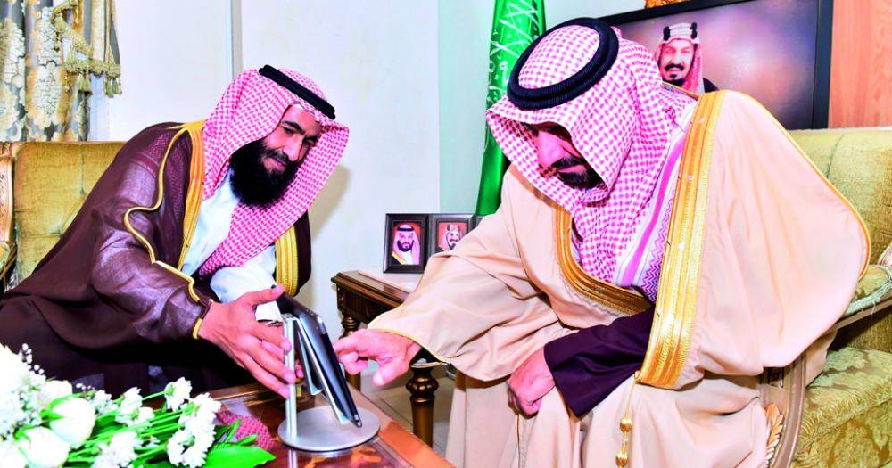 أمير نجران مدشنا الموقع الإلكتروني لجمعية تصلال الخيرية. (عكاظ)